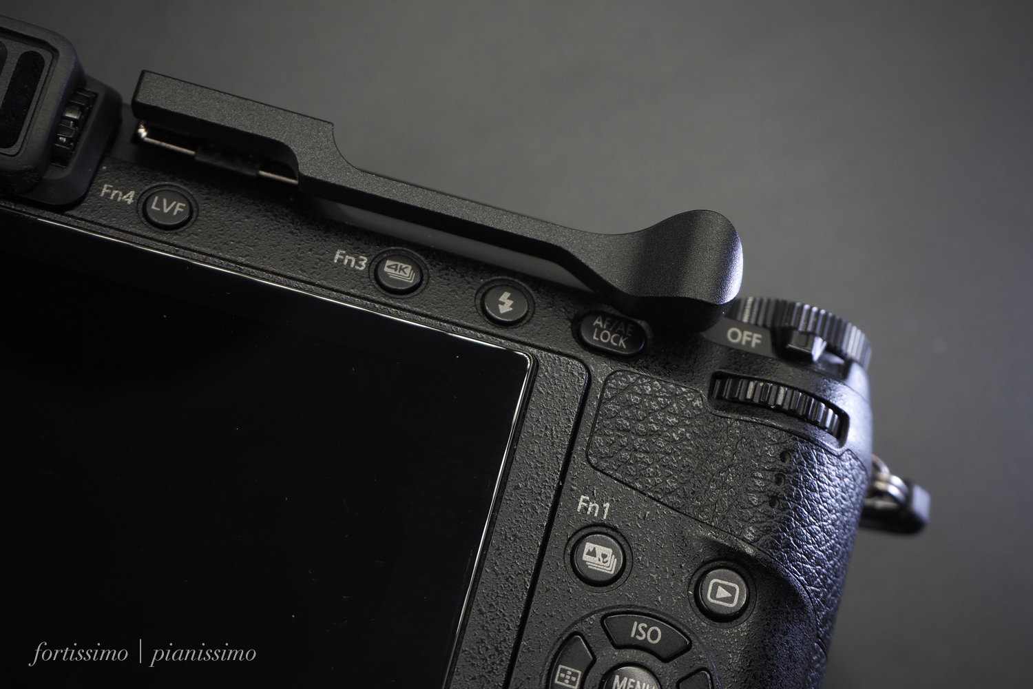 社外品ですがグリップ力強化用にサムレスト導入、小ぶりのレンズ使用時にはほとんど問題ないのですが、少し重めのレンズだとグリップの薄さもあって右手中指への変な負荷がかかり痛くなります。グリップ時の力がそこに異常にかかっている感じですが、このサムグリップ装着で親指に思いっきり力を入れられることで、中指への負担が軽減しました。前ダイヤルに露出補正割り振っていますので、露出とシャター押しは完全片手持ちで可能です。